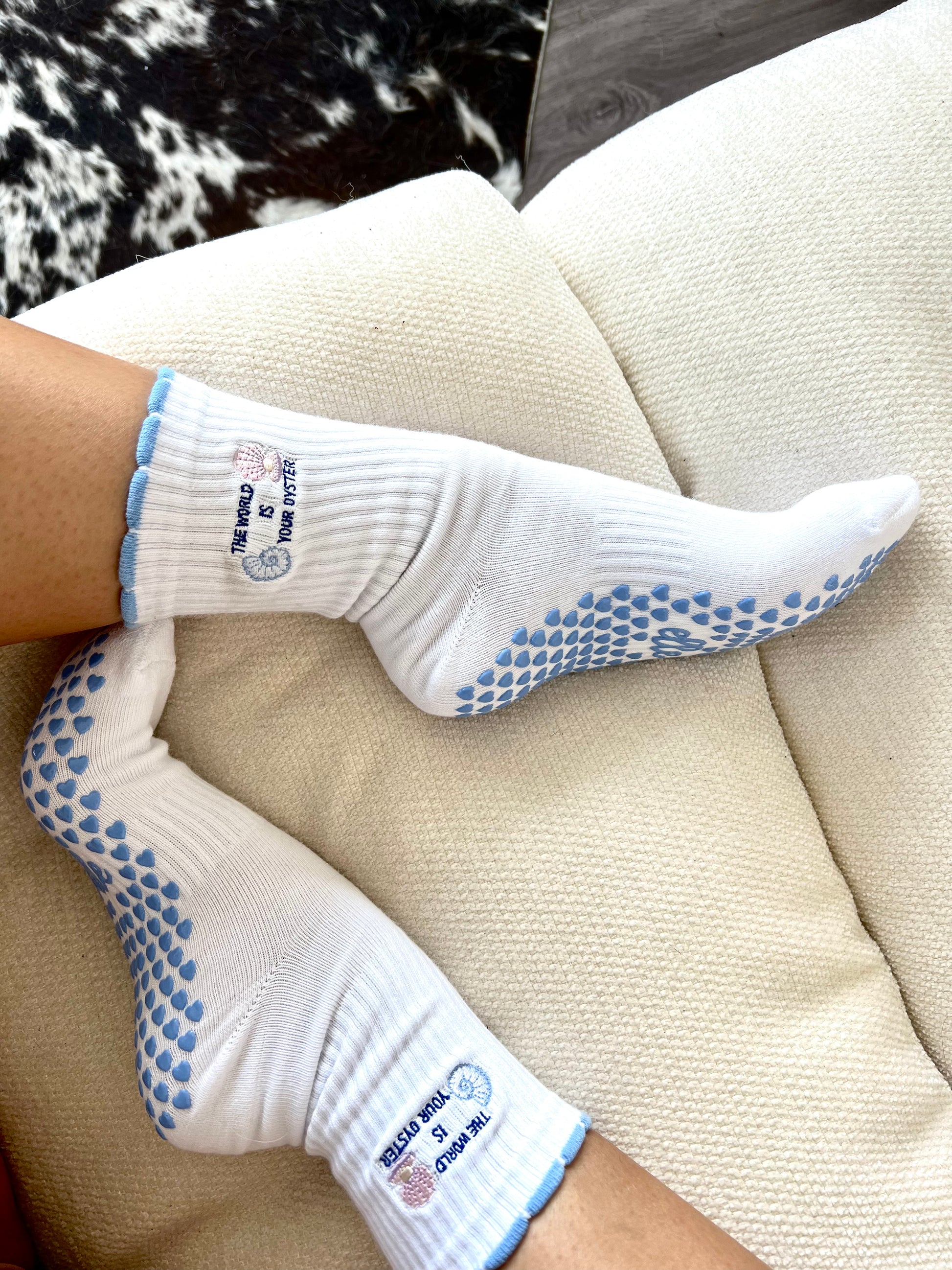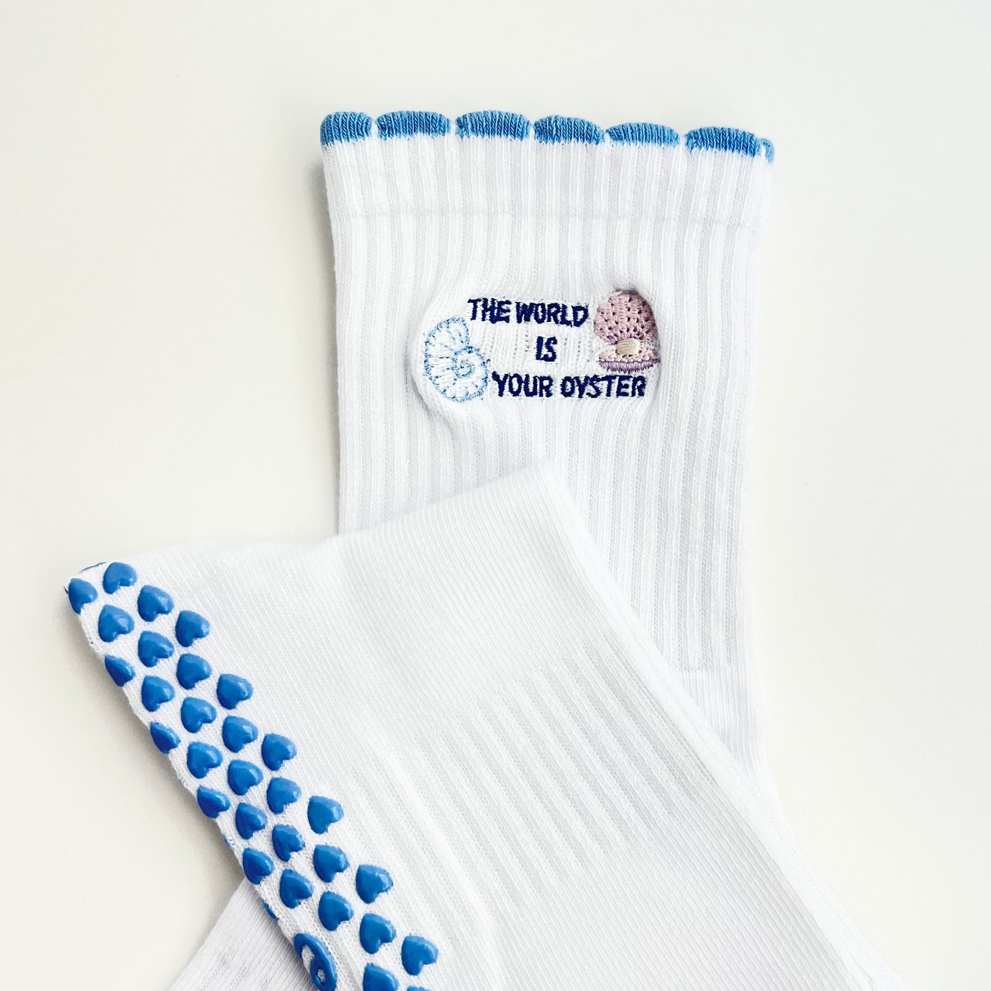 Set sail on new possibilities with our crew socks embroidered in French blue with the uplifting phrase "The World Is Your Oyster." These white crew socks pair secure, non-slip grips with soft, supportive fabric to give you stable, comfortable steps while reminding you that opportunity and wonder await.